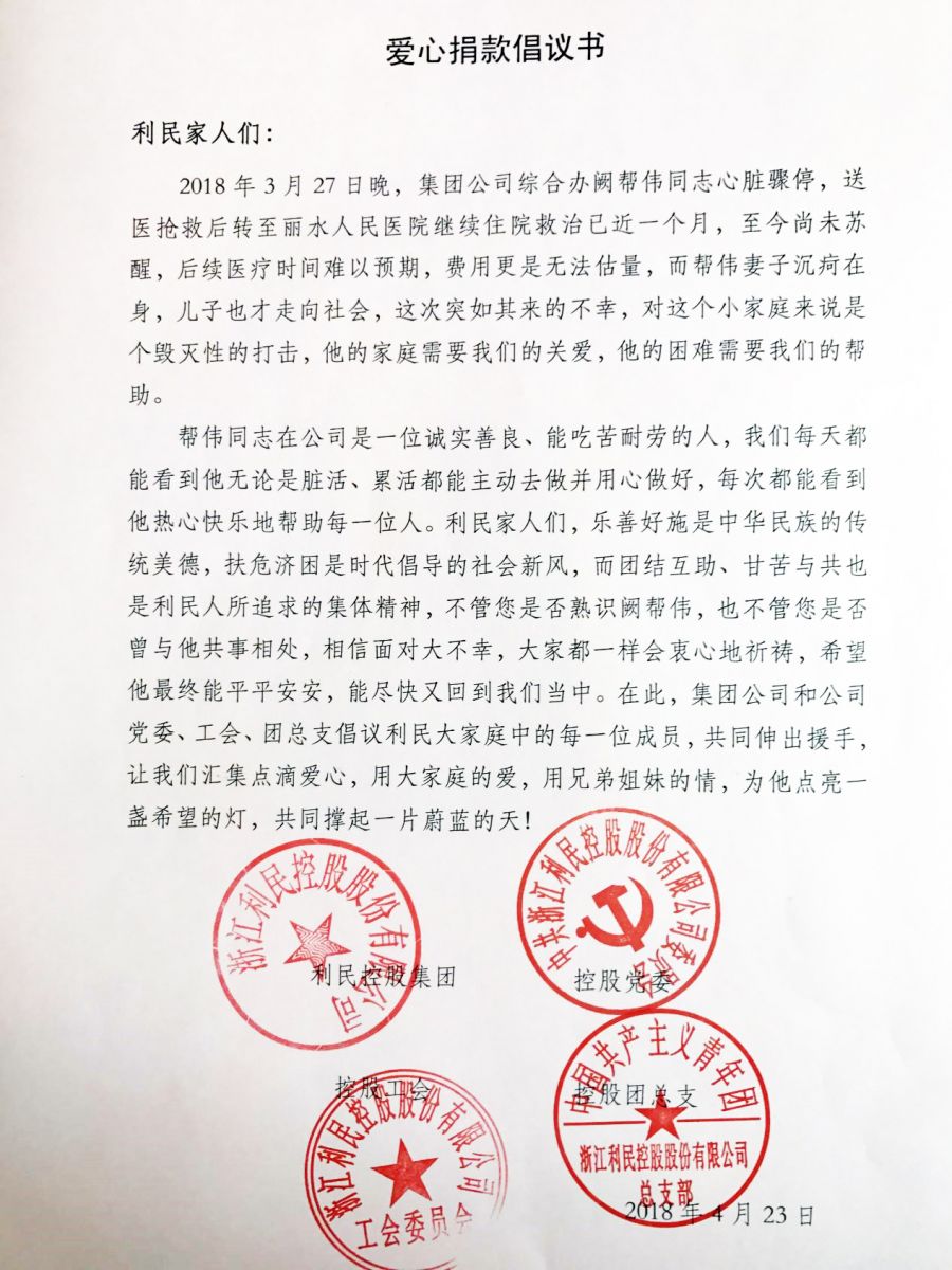 而當公司一名員工突發(fā)意外而致使其家庭陷入困境的時候,正是利民大家庭中的每一位成員,在公司黨政工團的共同倡議下,在雙節(jié)期間用大家庭的愛,用兄弟姐妹的情,共同匯集愛心,都伸出援手希望能為他點亮一盞希望的燈,幫他撐起一片晴朗的天!這是利民人團結(jié)奉獻、關(guān)愛他人、患難扶持的“利民家人”企業(yè)文化建設(shè)的一次成果,也是利民控股在圍繞社風(fēng)慈善、扶貧濟困方面履行的一個優(yōu)秀企業(yè)的社會責任的一次展現(xiàn)。今后,利民控股還將從公司實際出發(fā),與社會主義核心價值觀踐行、青年員工思想道德引領(lǐng)等工作有機結(jié)合,進一步提升“慈孝文化”的參與度、精準度,為“慈孝遂昌”建設(shè)貢獻一股“利民力量”!