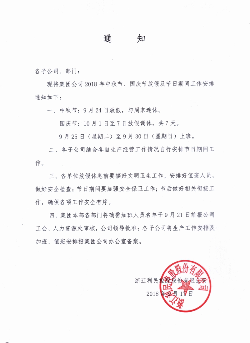 關(guān)于2018年中秋、國慶期間工作安排的通知